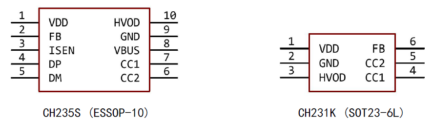 CH231K为CH235S的精简版本,使用SOT23-6L封装,并省去了DP/DM 相关的Type-A协议支持、VBUS放电功能、电流补偿与保护功能、过温保护功能。