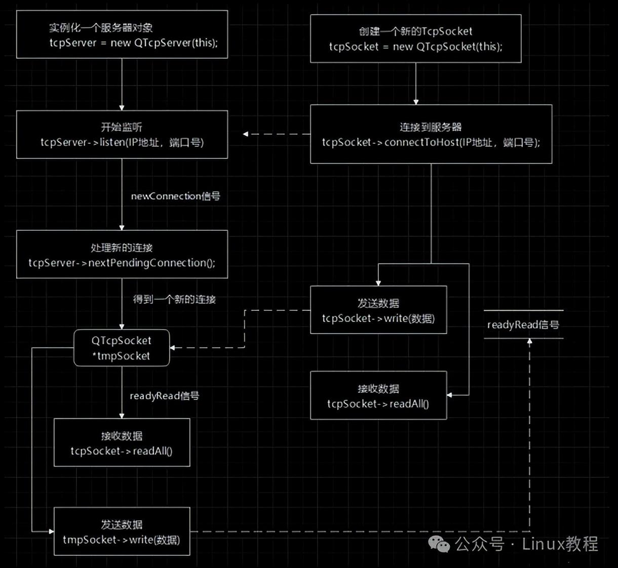 - 客户端:实例化 QTcpSocket → 主动连接服务端 IP / 端口 → 利用 QTcpSocket 发送数据,并通过 readyRead 信号响应服务端发来的数据。