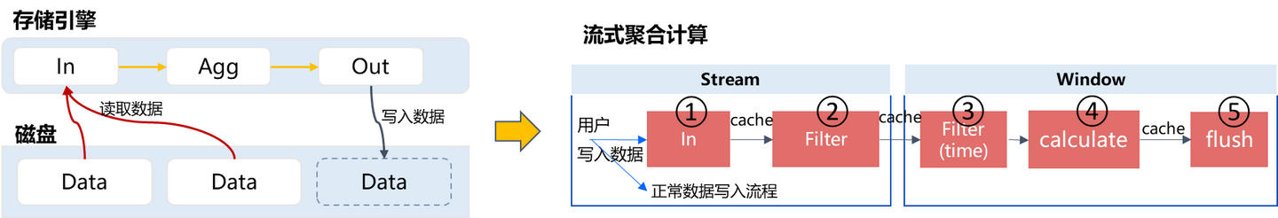 流式聚合计算,采用5级Pipeline,stream阶段负责任务管理,数据接入以及初步过滤。window阶段负责时间窗口过滤、计算、以及数据下盘。该方式具有高性能、网络开销小等优点,能有效降低数据降采样的资源消耗。