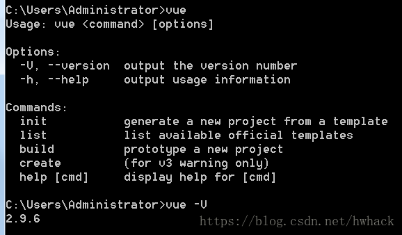 安装完成后,cmd窗口输入vue即可验证是否安装成功