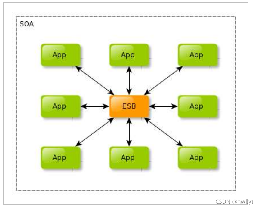 跟 SOA 相提并论的还有一个 ESB(企业服务总线),简单 来说 ESB 就是一根管道,用来连接各个服务节点。为了集成不同系统,不同协议的服务,ESB 做了消息的转化解释 和路由工作,让不同的服务互联互通。