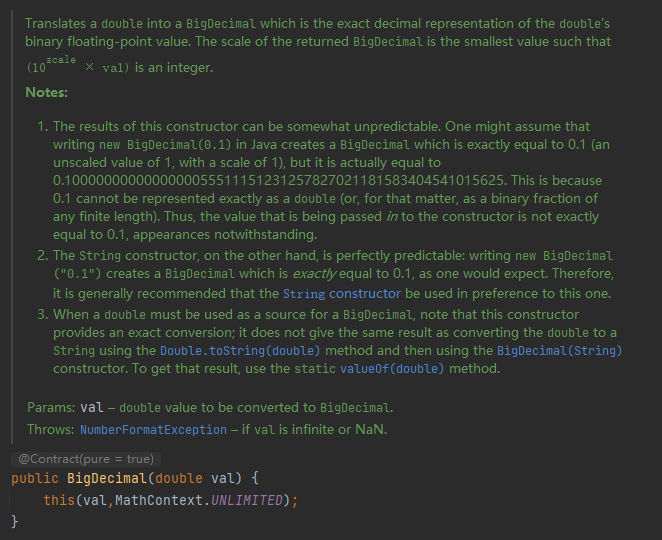| BigDecimal(double val) | 创建一个具有参数所指定双精度值的对象。不推荐使用,因为存在精度丢失问题。 |
