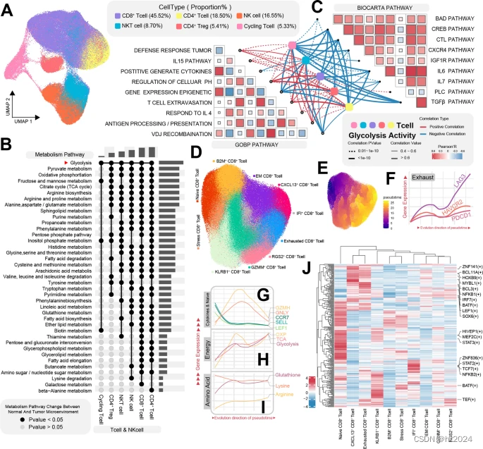 肿瘤微环境中T细胞的代谢异质性和动力学。T 细胞和 NK 细胞的 UMAP 图,按细胞类型进行颜色编码。B 肿瘤微环境和正常组织微环境之间各种 T 细胞亚型代谢活性的差异,由实心圆圈和空心圆圈表示,表示 p 值分别
