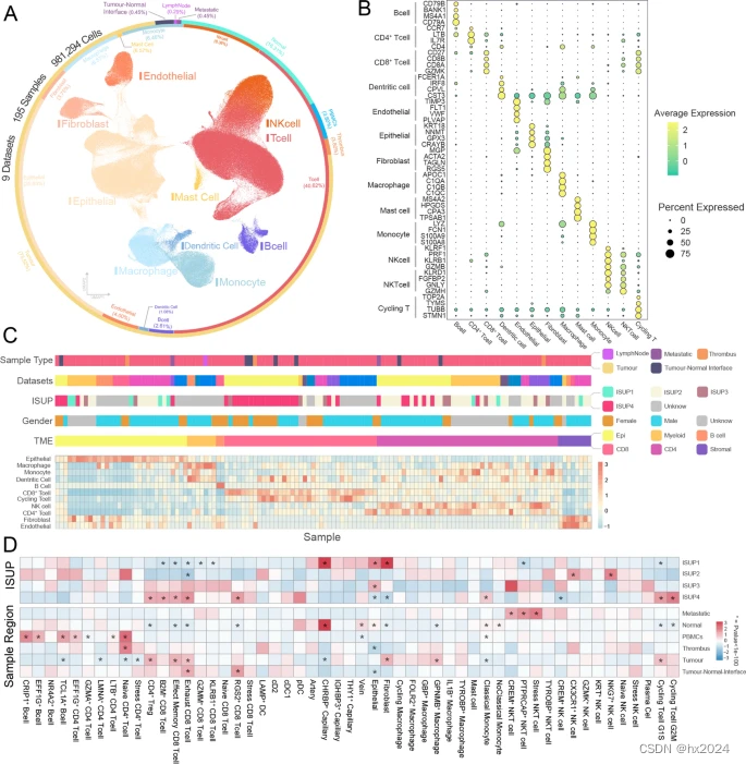 透明细胞肾细胞癌的高分辨率单细胞图谱。ccRCC 的 UMAP 可视化,内环表示细胞类型比例,外环表示组织来源比例。B 点图说明了主要细胞类型的标记基因表达。C 显示样本信息、肿瘤微环境分类组和肿瘤样本的细胞浸润富集水平的热图。D 热图显示了不同 ISUP 组织学等级和采样点的肿瘤微环境中的细胞浸润富集水平。ISUP:国际泌尿病理学会;UMAP:均匀流形近似和投影.