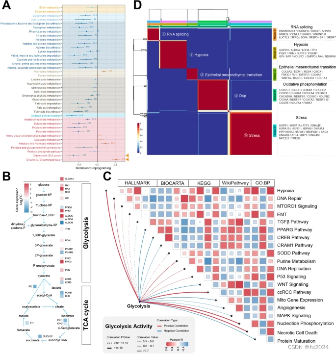 透明细胞肾细胞癌肿瘤细胞的糖酵解活性明显增强。描绘肿瘤细胞和正常上皮细胞之间多种代谢途径差异活性的森林图,不同的背景颜色代表不同的代谢类别。B 肿瘤细胞和正常上皮细胞之间糖酵解和三羧酸 (TCA) 循环相关基因的差异表达,红色突出显示在肿瘤细胞中高表达,蓝色表示在正常上皮细胞中高表达。C 显示肿瘤细胞中糖酵解活性与各种生物学功能之间关联的相关热图。D 肿瘤细胞不同状态的相关性热图,其中红色表示高相关性,蓝色表示低相关性。EMT:上皮-间充质转化;Oxp:氧化磷酸化