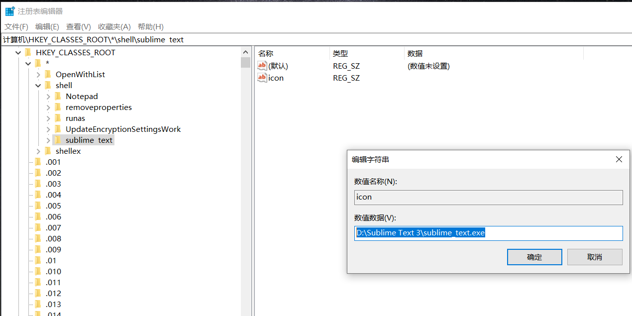 点击"icon" , 在 "数值数据(v)" 中输入安装位置, 如 "D:\Sublime Text 3\sublime_text.exe"