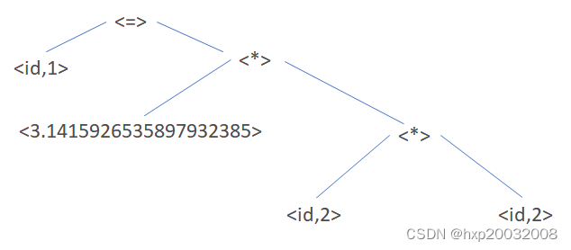 这里还是以area=pi*r*r这条语句为例,词法分析步骤读入源程序的字符流,并将它们组织成为有意义的词素(lexeme)的序列。词法分析器产生形如<token-name,attribute-value>的词法单元作为输出。这里area是一个词素,对应的词法单元为<id,1>,其中id是表示标识符的抽象符号,而1指向符号表中area对应的条目。一个标识符对应的符号表条目存放该标识符有关的信息,比如它的名字和类型。赋值符号=是一个词素,对应的词法单位为<=>。因为这个词法单元不需要属性值,所以这里省略了第二个分量。pi是一个常数,也是一个词素,对应的词法单元为<3.1415926535897932385>。*是一个词素,被影射成词法单元<*>。r是一个词素,被映射为词法单元<id,2>,其中2指向r对应的符号表条目。经过词法分析后area=pi*r*r被表示为如下的词法单元序列:<id,1><=><3.1415926535897932385><*><id,2><*><id,2>。
