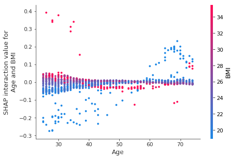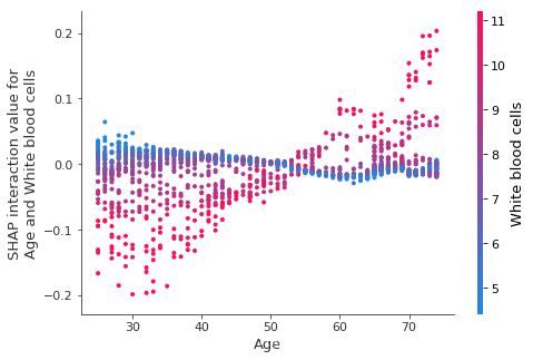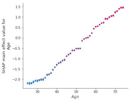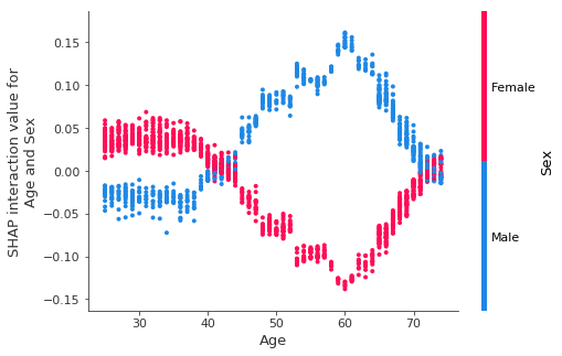 Now we plot the interaction effects involving age. These effects capture all of the vertical dispersion that was present in the original SHAP plot but is missing from the main effects plot above. The plot below involving age and sex shows that the sex-based death risk gap varies by age and peaks at age 60.