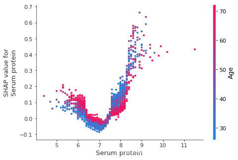 shap.dependence_plot("Serum protein", shap_values, X)