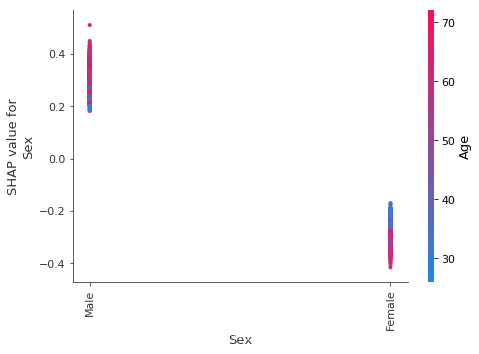 shap.dependence_plot("Sex", shap_values, X, display_features=X_display)