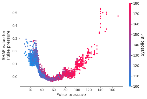 shap.dependence_plot("Pulse pressure", shap_values, X)