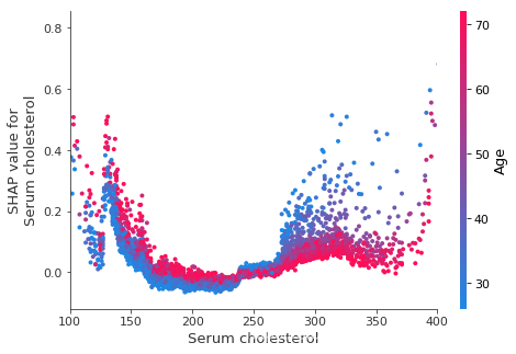 Below we give the SHAP dependence plot for each of the NHANES I features, revealing interesting but expected trends. Keep in mind the calibration of some of these values can be different than a modern lab test so be careful drawing conclusions.