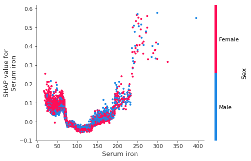 shap.dependence_plot("Serum iron", shap_values, X, display_features=X_display)