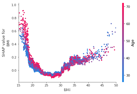 shap.dependence_plot("BMI", shap_values, X, display_features=X_display, show=False)