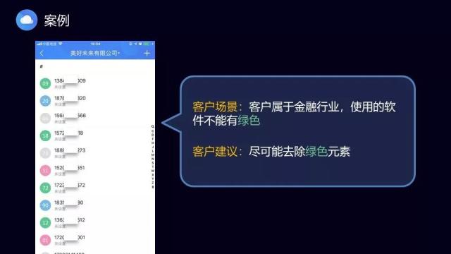 一家金融行业的负责人就跟我们提到了:头像不可以用绿色的,因为金融行业见不得绿色;即使是个初始化的环节,也不能见绿,而且产品里面尽可能要把绿色的元素去掉。