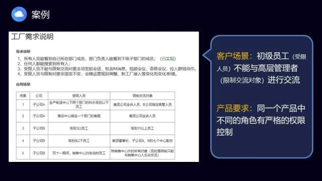 一个工厂工人可以在组织架构里面看到老板是谁、CXO是谁,但也只限于看到。这个工人没有权限和老板、CXO发起会话、打电话、发起会议等。