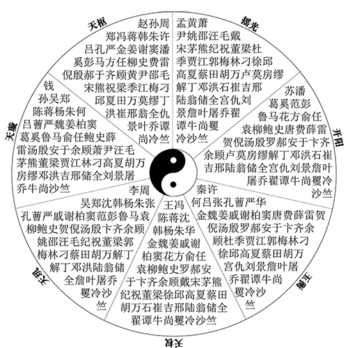 为了更直观地解释这个“把戏”,本文以从《百家姓》中选取的127个比较常见姓氏为基础,精心制作了一张带姓氏的八卦图。为了增加神秘感,将七个区用为北斗七星星名命名: