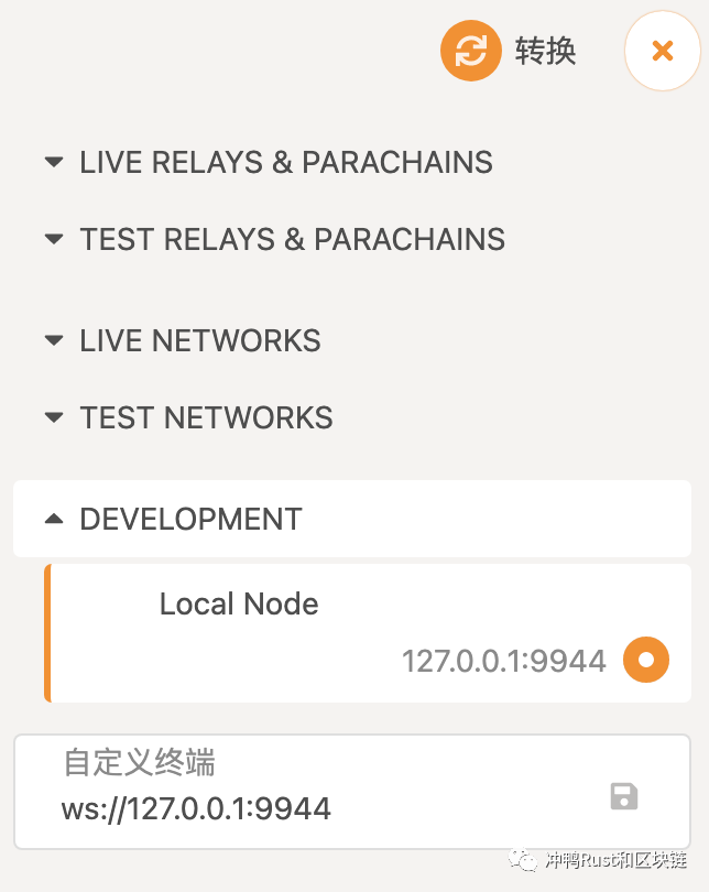 打开网址 https://polkadot.js.org/apps,配置连接本地启动的开发节点。