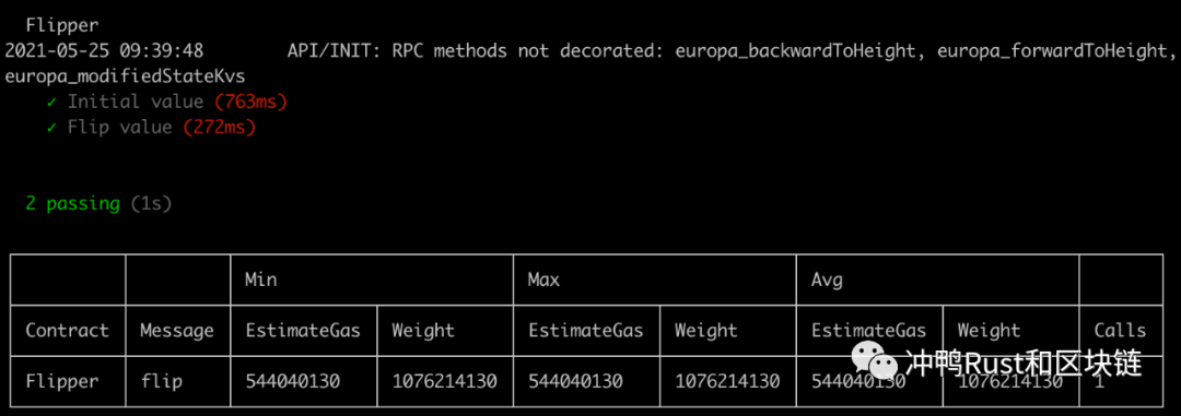 看到如下结果,代表已成功完成测试,Redspot 的插件 会自动计算并打印出执行合约操作的 Gas 费用。
