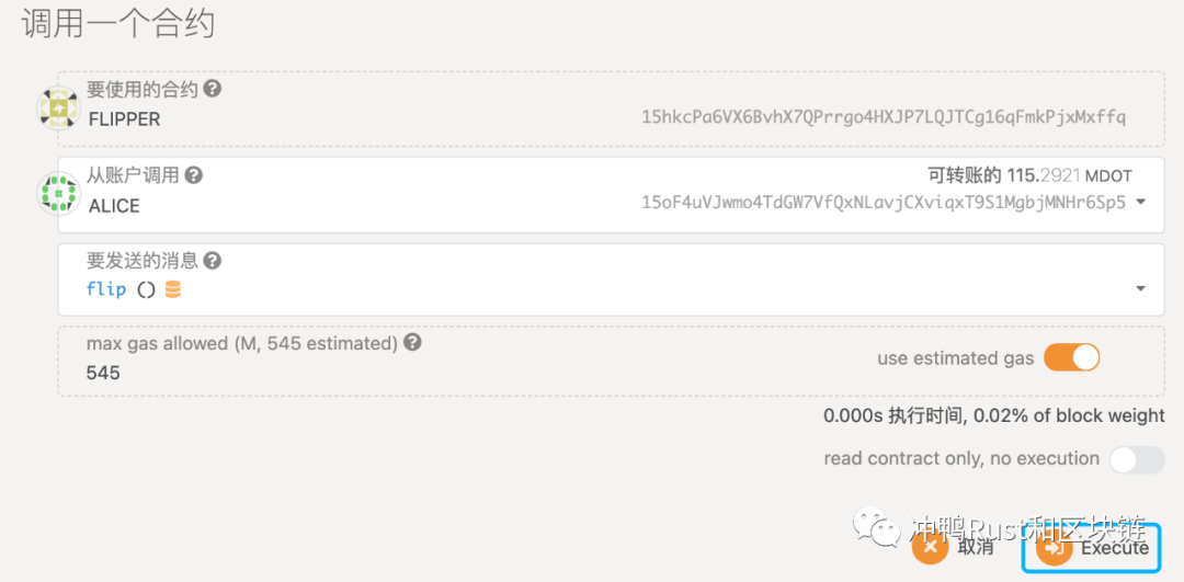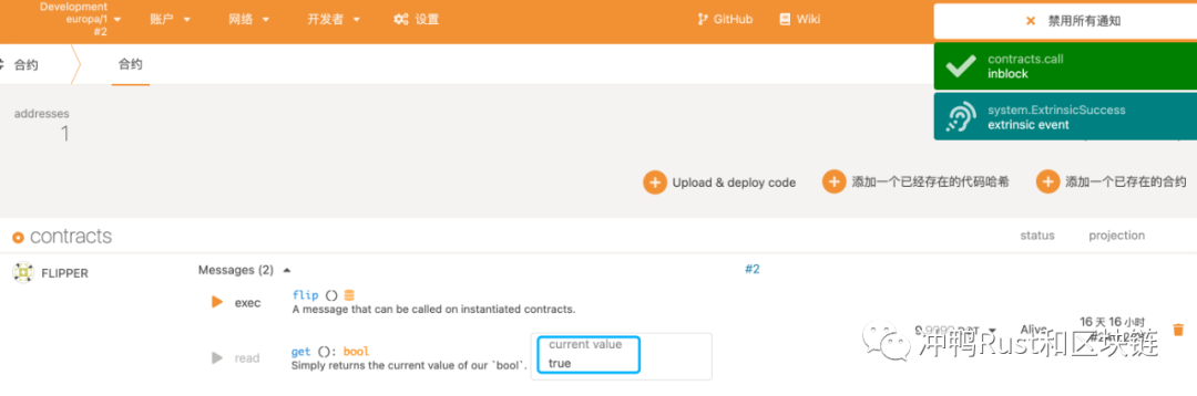 点击“flip()”左边的“exec”按钮,调用合约的 flip 方法,签名提交后布尔对象的当前值变成了 true,这个合约交互结果符合预期。