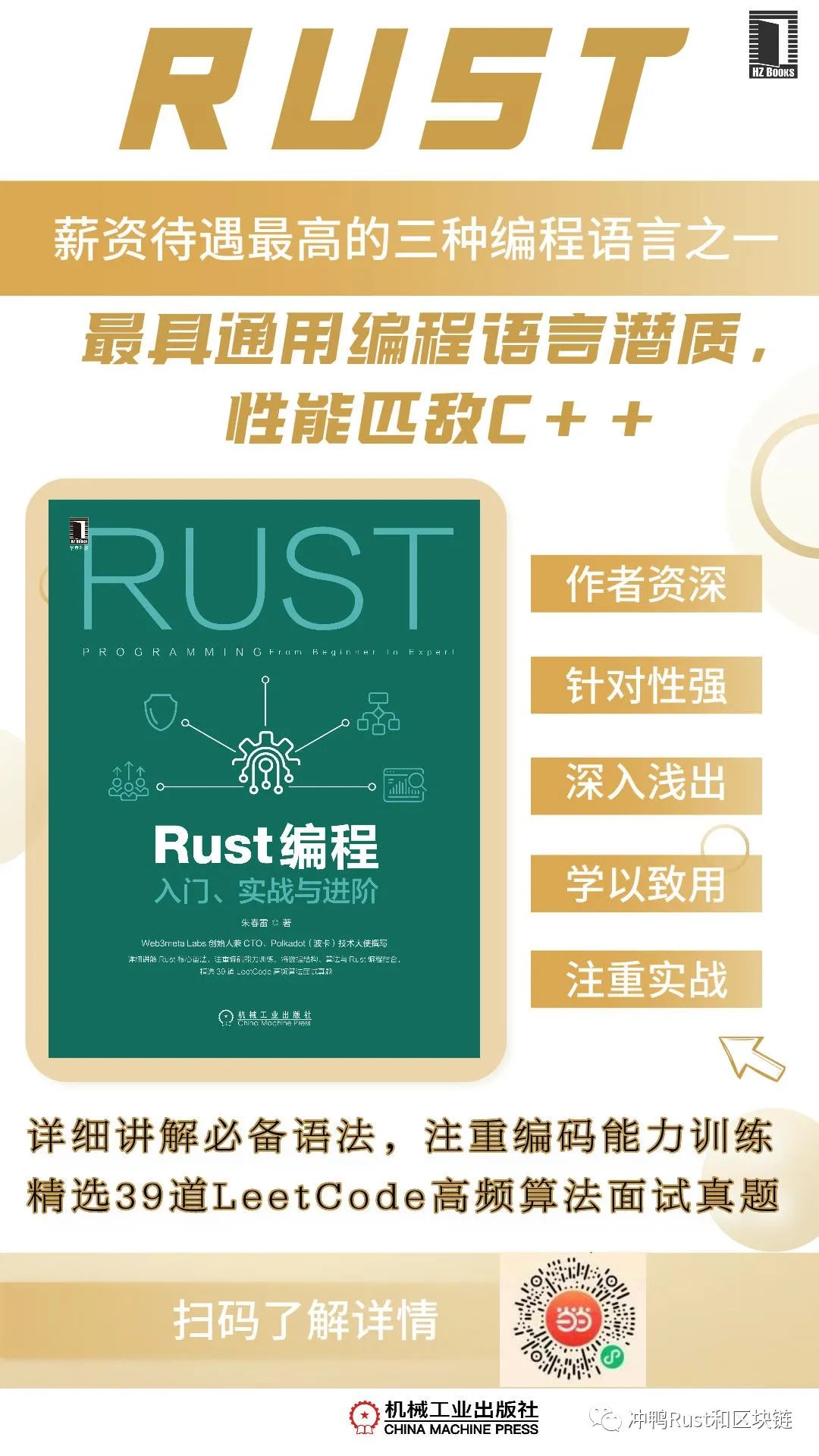 推荐 Rust 入门学习书籍《Rust 编程入门、实战与进阶》,该书详细讲解 Rust 核心语法,注重编码能力训练,将数据结构、算法与 Rust 编程结合,精选 39 道 LeetCode 高频算法面试真题。需要购买书籍的朋友,可以扫描下方二维码,或者点击文章左下角的“阅读原文”。