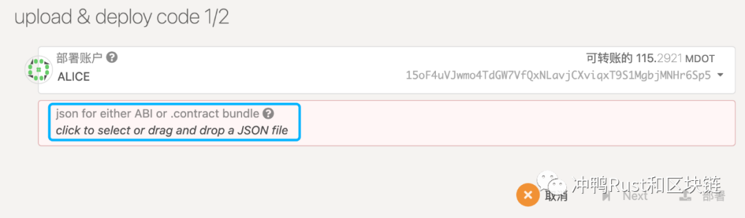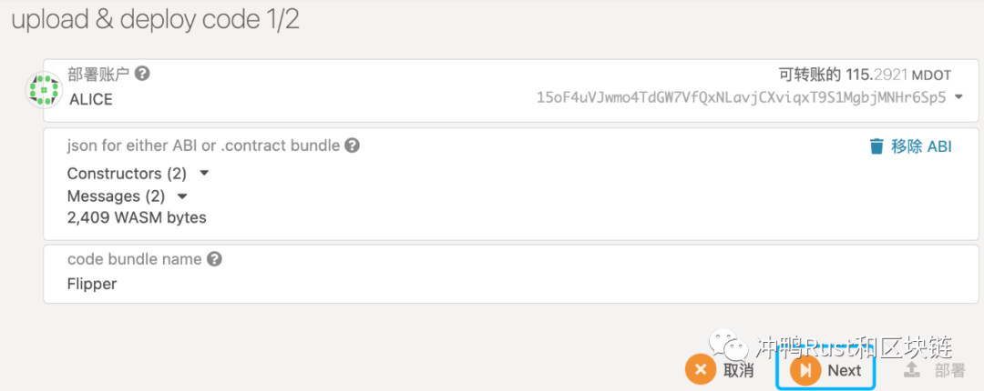 “upload & deploy code 1/2”窗口对应部署合约的第一个步骤——上传代码到区块链上。选择有帐户余额的部署帐户,再上传 Flipper.contract 文件,确认智能合约的信息后,点击“Next”按钮。