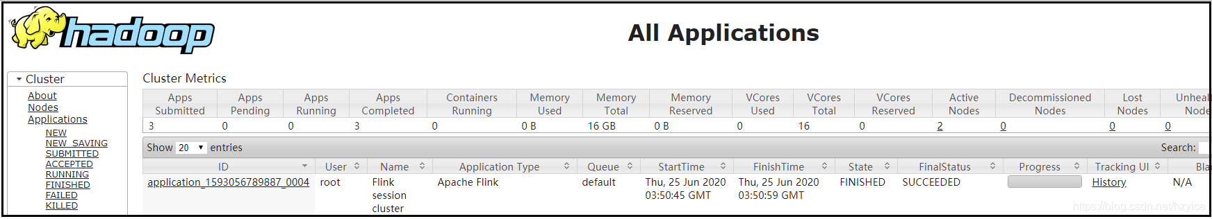 3) 重新提交jar包,运行成功 ./bin/flink run -m yarn-cluster -yn 1 ./examples/batch/WordCount.jar