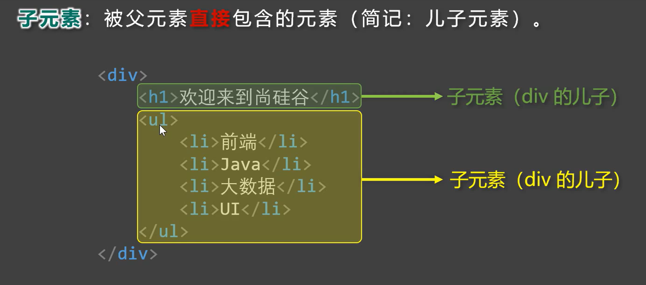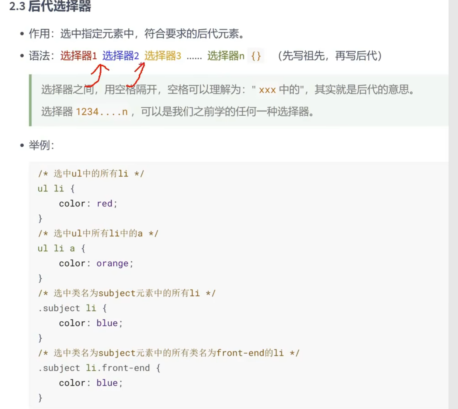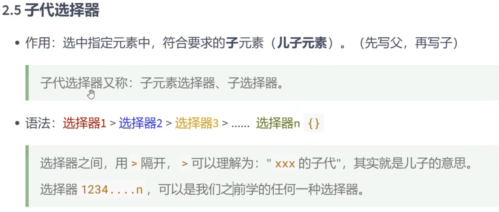 1.子代选择器,最终选择的是子代,不是父级。