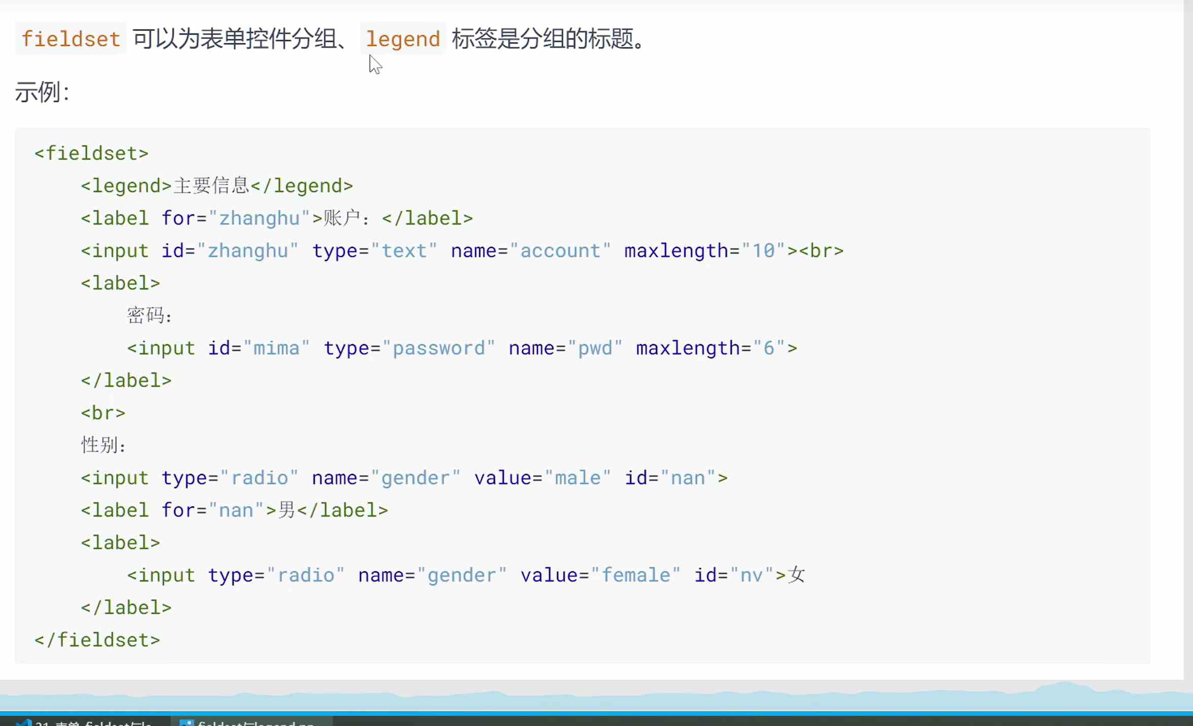 label标签可与表单控件相关联,关联之后点击文字,与之对应的表单控件就会获取焦点。两种与label关联方式如下: