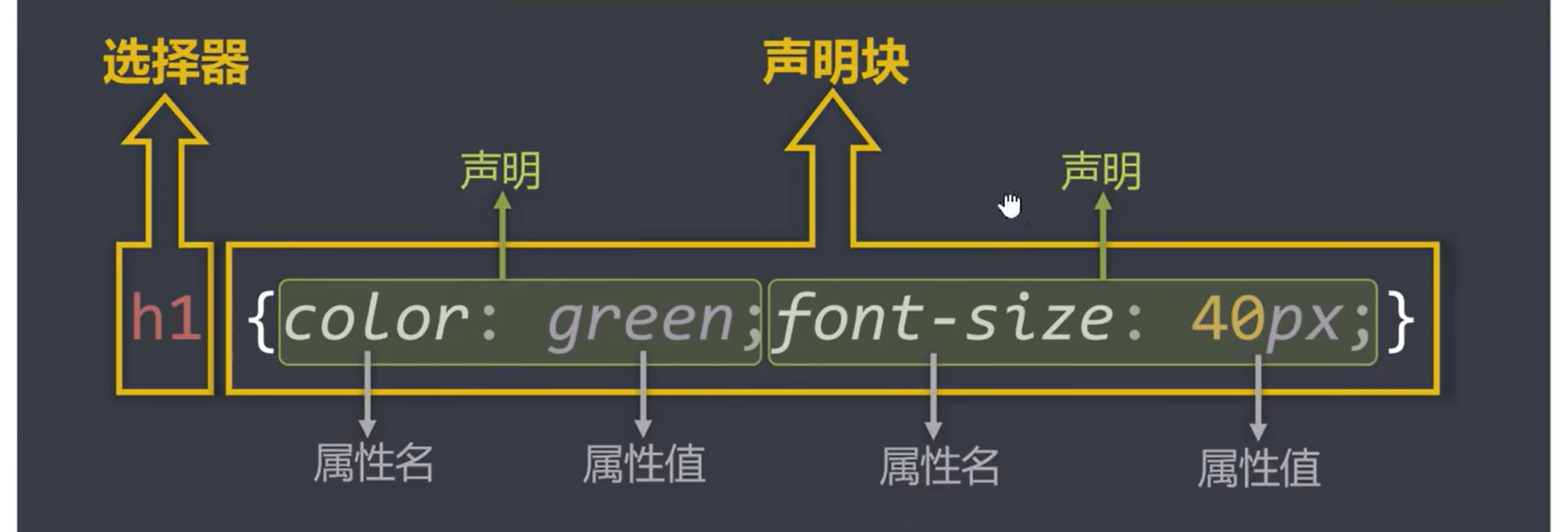 2.声明块:设置具体的样式(声明块是由一个或多个声明组成的),声明的格式为:属性名:属性值;