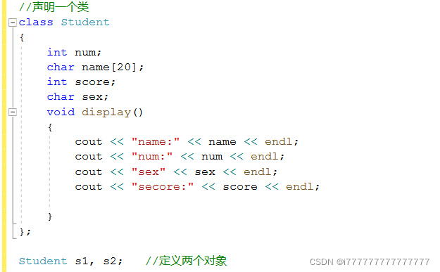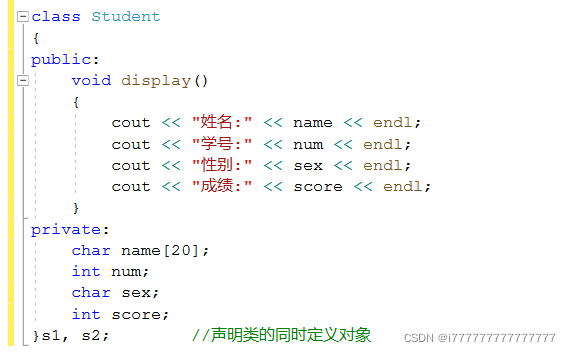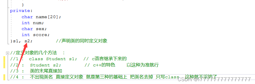 总结 : 在有class Student {...}; 类声明之后 定义对象时 直接写Student s1; 即可 s1 就是具有Student类特征的对象 (在定义一个对象时 编译系统会为这个对象分配存储空间,以存放对象中的成员)