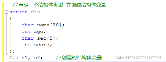 上图为声明的一个结构体类型 结构体类型名为Stu s1 s2为创建出的结构体变量 这里面只有数据 没有操作(函数)