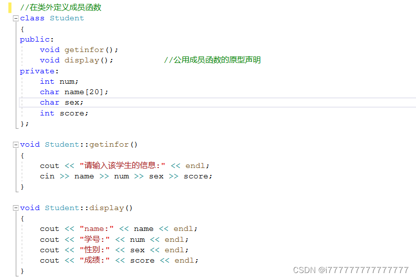 注意 在类外定义成员函数时 需要在函数名前加上类名 予以限定 "::" 是作用域限定符 或 作用域运算符 用它声明函数是属于哪一个类的 这个是很有必要的... 可以设想不加之后会怎样