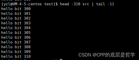 head -310 src 表示取出src前310行的内容 | 表示管道 表示前方用head处理过的数据,用管道传输,再用tail -11指令处理,表示取出其中的末尾11行。