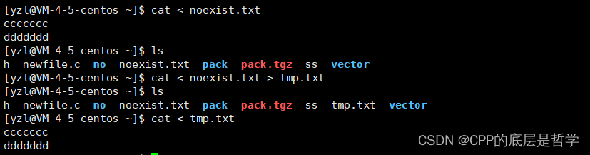 cat < noexist.txt > tmp.txt 就是输入重定向和输出重定向的运用,从文件中输入,然后输出到文件中。(Linux下,一切皆文件,键盘,显示器,普通文件在底层都实现为了文件模型,只是他们的读写方式不一样,后期再深入学习) (上方指令也可以省略掉输入重定向,相当于直接在noexist.txt中读取数据而已。少了一步)