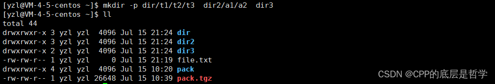 [yzl@VM-4-5-centos ~]$ mkdir -p dir/t1/t2/t3 dir2/a1/a2 dir3