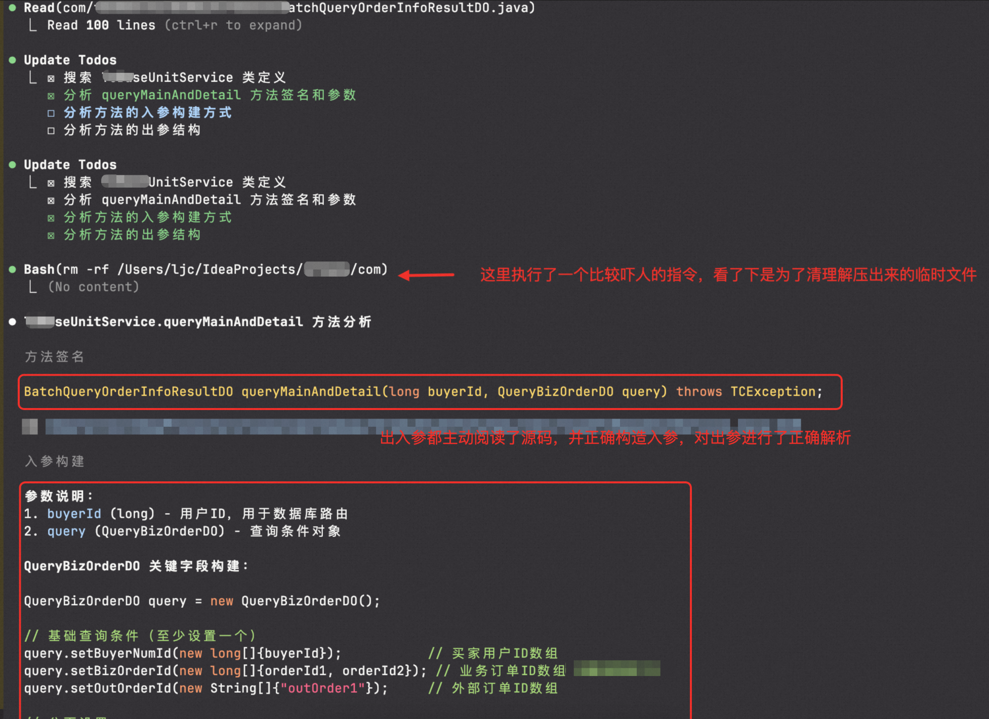 进行到这里,我感觉自己不是在和AI结对编程,而是在辅导一个记性不好还爱幻想的孩子写作业。另外看了一下入参 xxxQueryXxxOrderDO 定义有两千多行,返回对象 xxxOrderInfoResultDO 内部也有多层逻辑