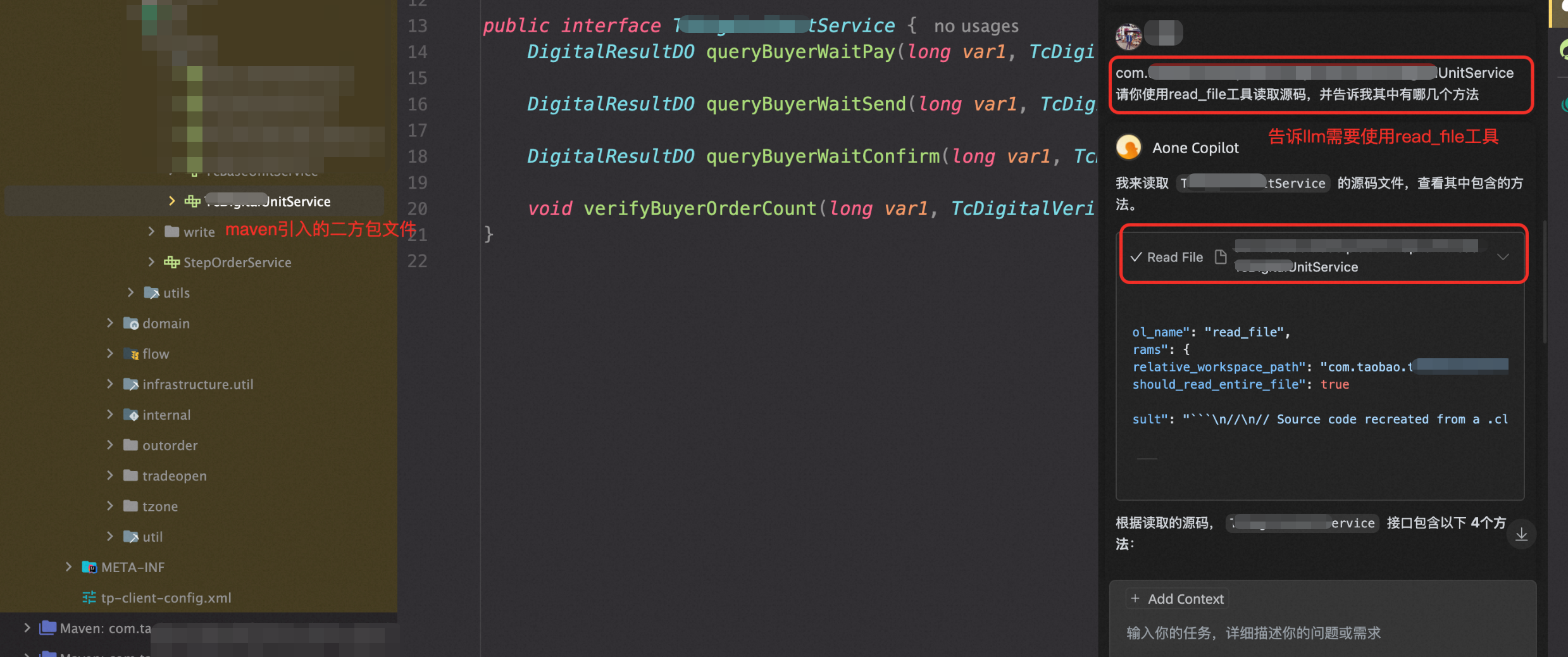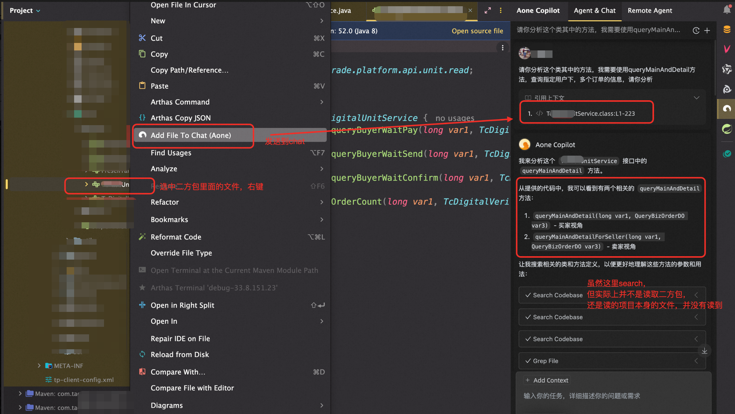 你可能会有疑问,如果这个二方包没有上传源码的情况,agent能否拿到代码内容呢?我试了一下,发现是可以拿到代码呢,我在AoneCopilot文档中看了一下他们回答:当使用“Add File To Chat”功能时,IDE已经帮您完成了文件读取和反编译工作,并将结果直接提供给AoneCopilot,所以此时他能够直接拿到反编译的代码内容