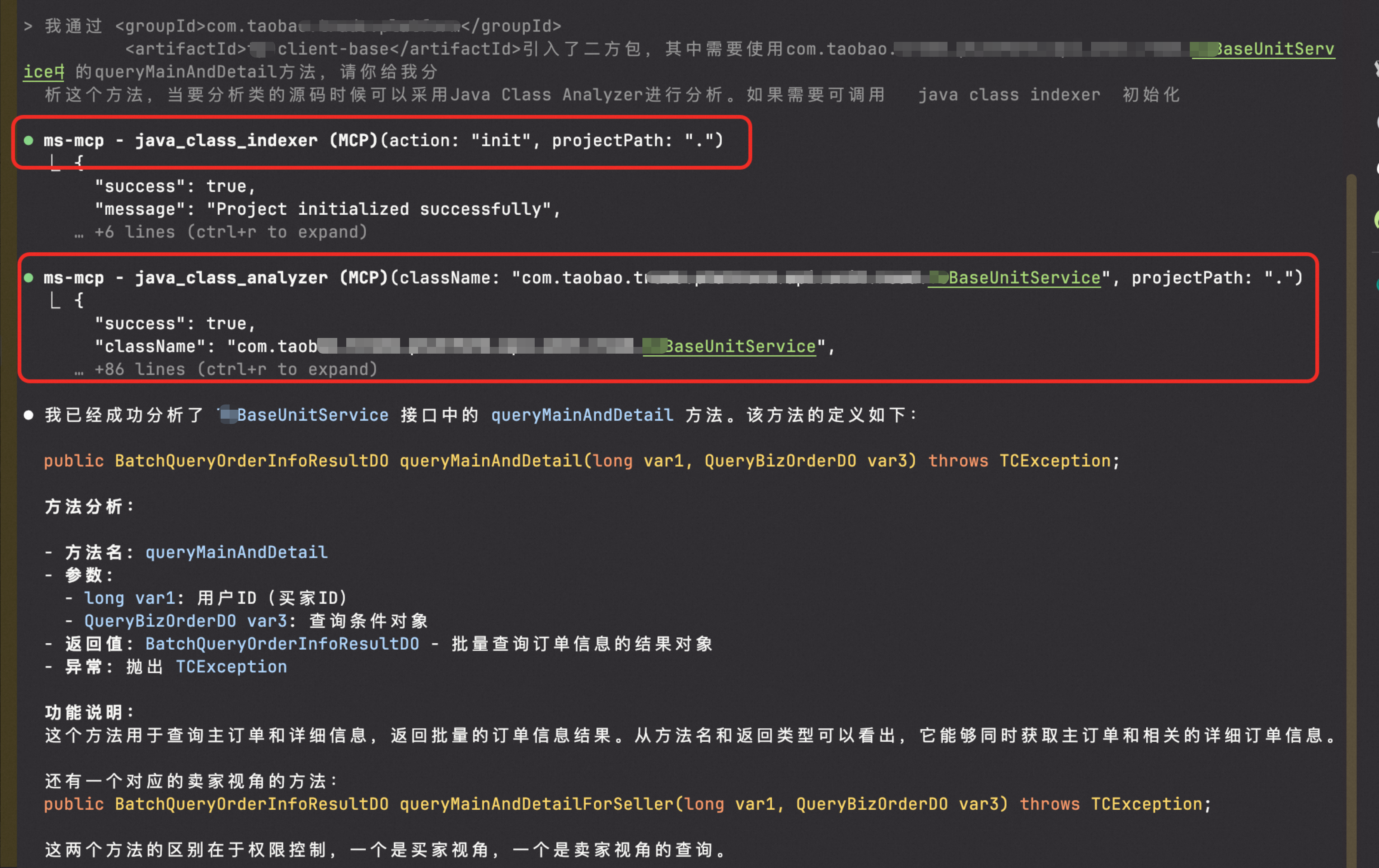 可以看到,通过索引工具和类分析工具大模型非常好的就获取了完整的类、出入参的说明。