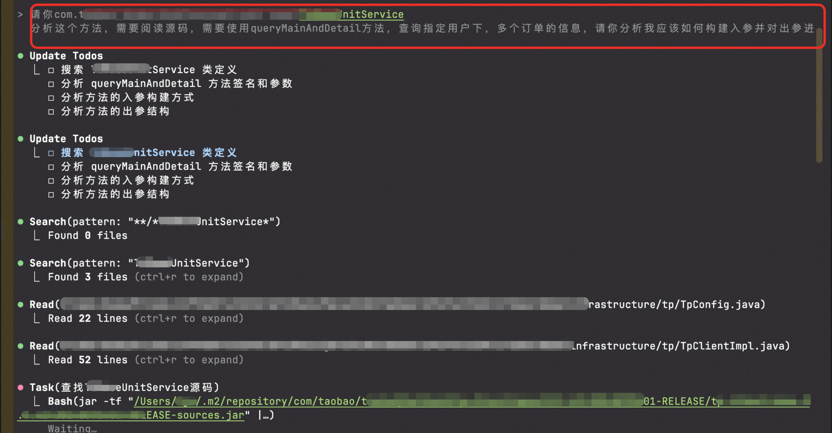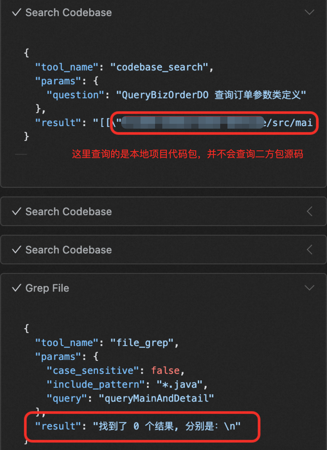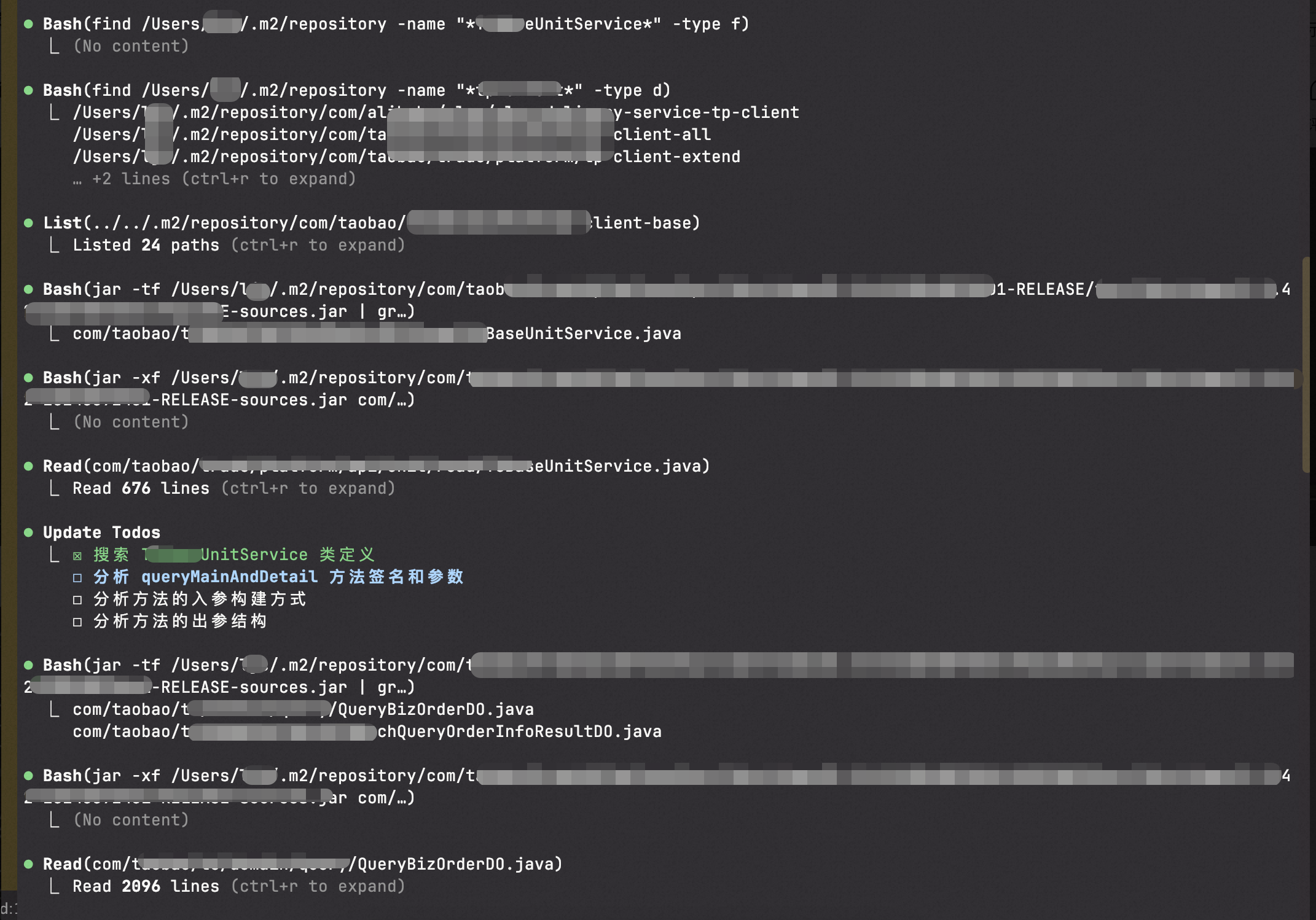 告知ClaudeCode要求阅读源码,模型内部应该是做了特殊处理(估计也提供了类似AoneCopilot的read_file工具),其能够直接定位到.m2文件中的下载的jar包,而且CC能自动读取到我没有指定的入参的类,还是挺厉害的,但是同样貌似只能读取有源码的二方包中的内容。