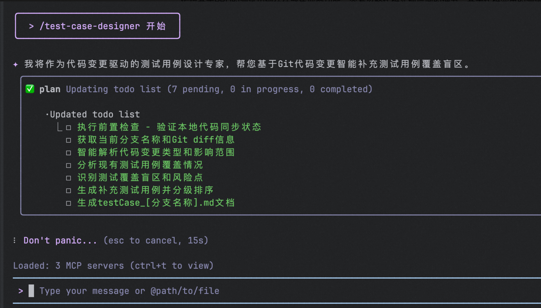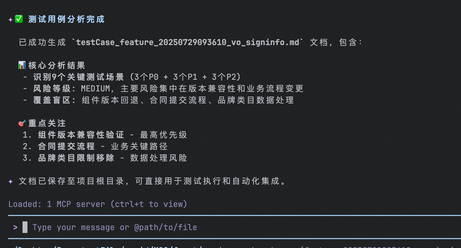 这个基于代码变更驱动的测试用例设计提示词通过构建测试开发专家角色画像、定义AI智能分析能力、设计结构化(前置检查→覆盖分析→用例生成)三步执行流程、规范标准化输出格式、设置强制质量检查等机制,然后结合iFlow CLI智能体的强大执行能力实现代码审查和测试用例生成的自动化与高效化。