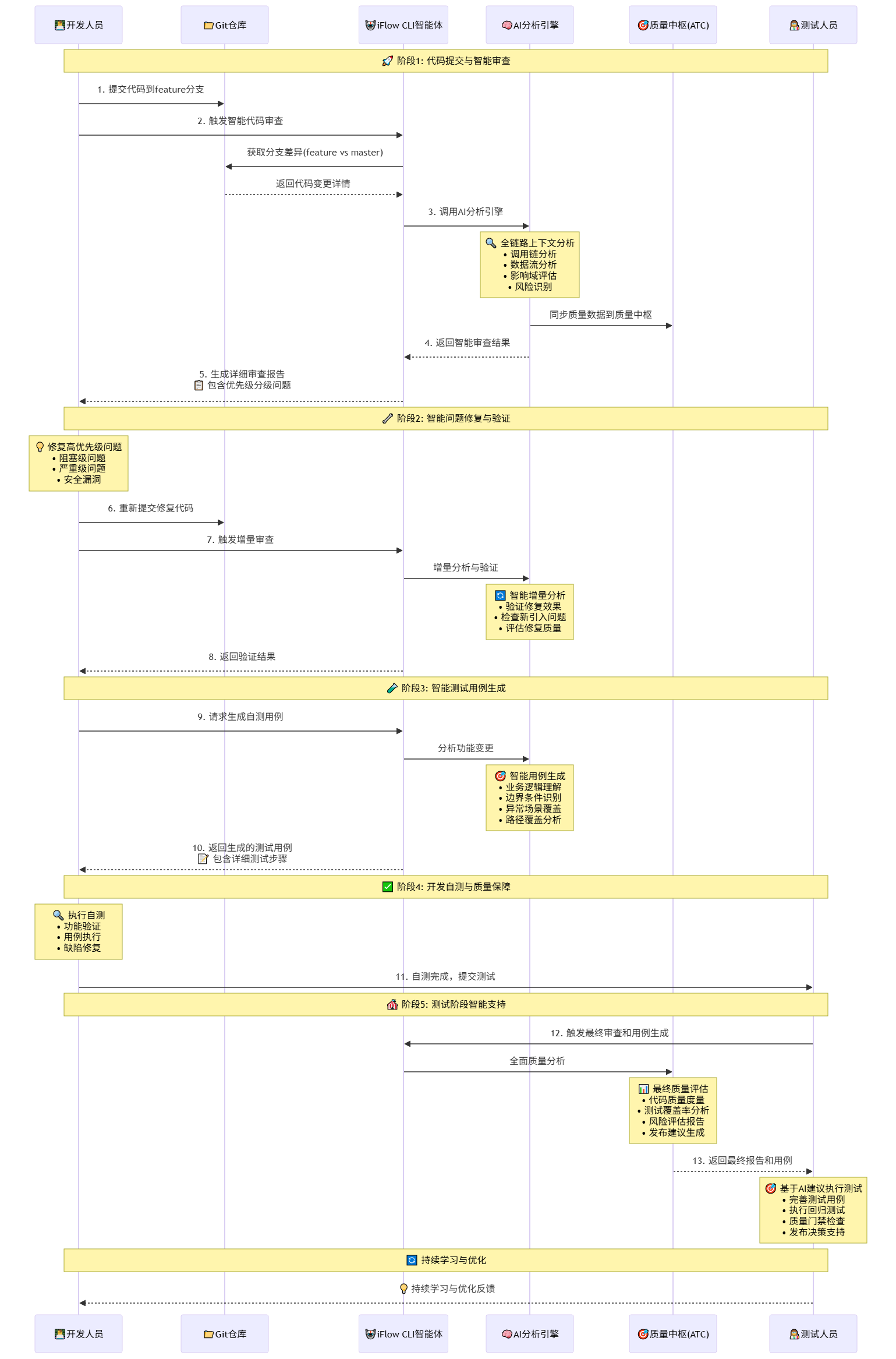 我们团队当前开发的AI测试智能体(ATC,AI Test Center)平台,正在规划构建软件研发全生命周期的“质量中枢”,后续可以深度结合iFlow CLI等AI智能体能力打造一个覆盖软件全生命周期的AI质量保障体系。通过将智能体分析的代码审查报告、测试用例报告等研发质量过程数据沉淀到ATC平台,实现质量数据的统一管理、智能分析和持续改进,构建企业级的质量知识库和最佳实践沉淀体系,让每一次质量活动都成为组织能力的积累。例如在未来的需求提测阶段整体流程时序图应该如下所示。