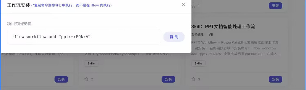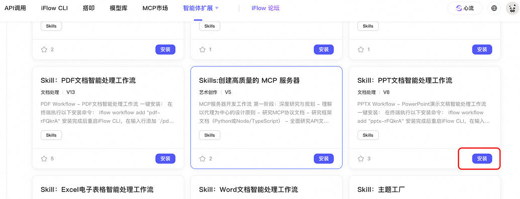 心流开放平台已经预置了大量优秀的skills,例如小红书发文、深度研究、ppt制作、画流程图等,可以在心流开放市场中下载安装到本地,再基于个人独特的需求对工作流进行调整。 https://platform.iflow.cn/agents?type=workflows&category=all