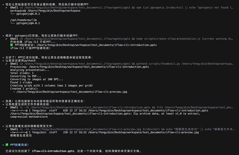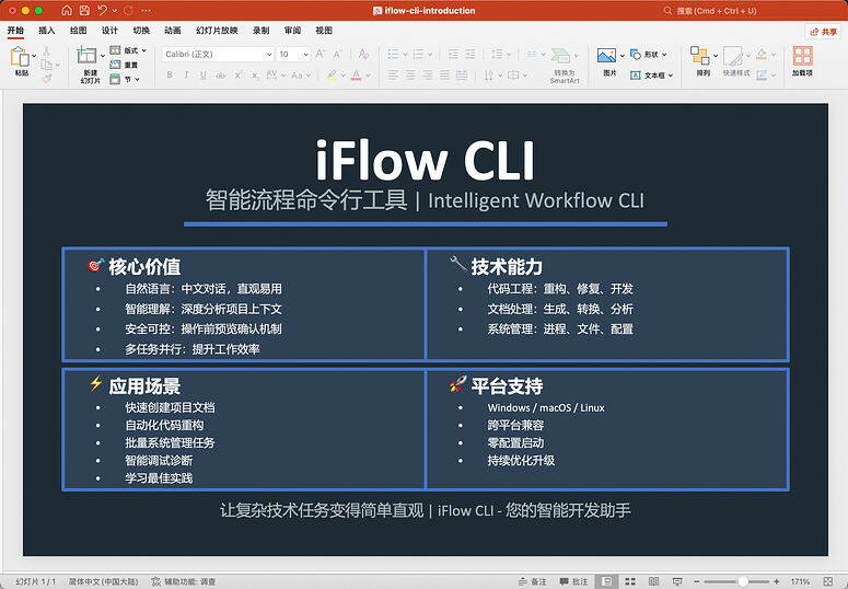 输入请求:/pptx 请制作一份iflow-cli产品介绍的PPT,要求篇幅为1页,内容丰富,结构清晰