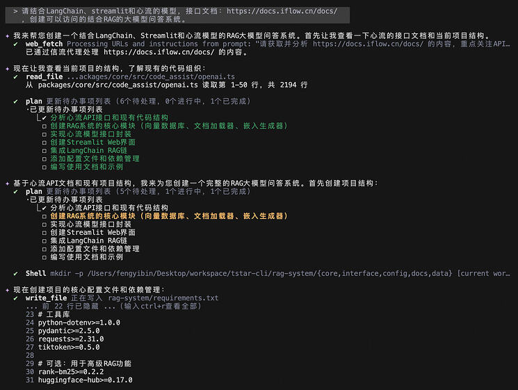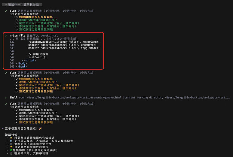 在工作过程中可见,模型响应速度快,能够自主顺利地制定开发计划和调用工具,并保持持续工作的稳定性: