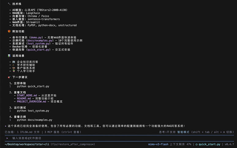 经过上述开发项目实测,MiMo-V2-Flash 在 iFlow-CLI 的加持下展现出了出色的工作能力。得益于 iFlow-CLI 提供的丰富工具和上下文管理机制,模型能够自主制定开发计划、精准调用工具、持续推进任务,从 RAG 系统的架构设计到五子棋游戏的一次性生成,整个过程流畅且可控。