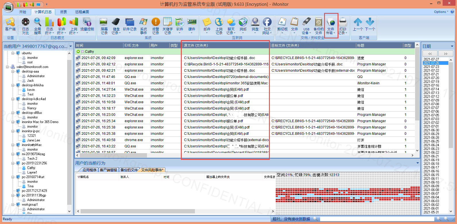 企业内部重要资料怎么会被泄露呢?一般的对外泄露方式有两种方式,一种是外接硬件设备拷贝,比如U盘,移动硬盘,手机等。另一种方式是通过软件传输,比如聊天工具,邮件,浏览器等形式将文件外发出去。企业通过电脑监控软件 iMonitor EAM 可以对文件进行管理,可以对文件自动备份,保存文件外发记录,禁止文件外发,对文件进行加密等方式来管控。