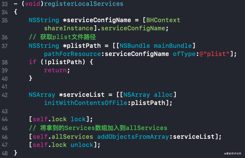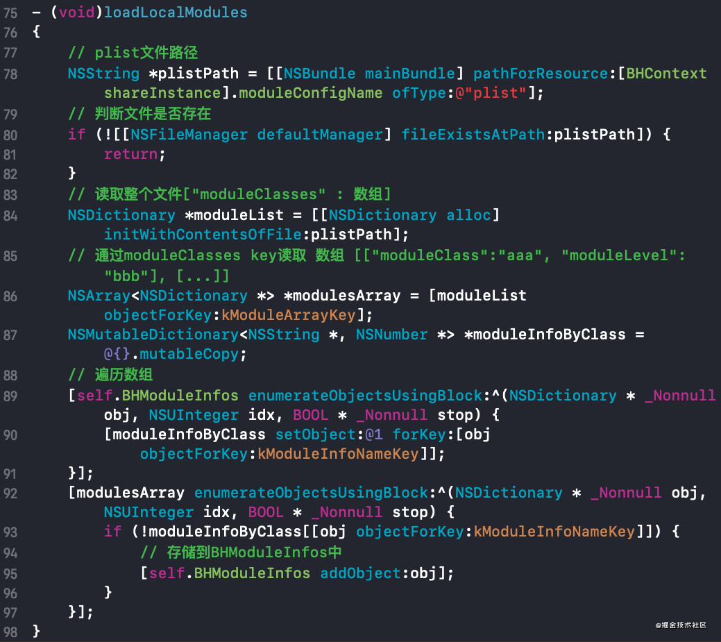 - 进入loadLocalModules方法,主要是从plist里面取出数组,然后把数组加入到BHModuleInfos数组里