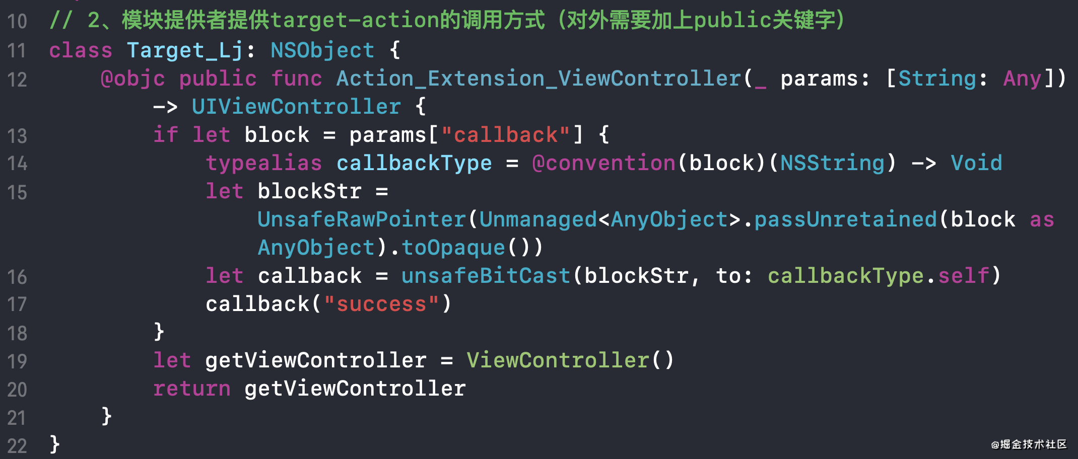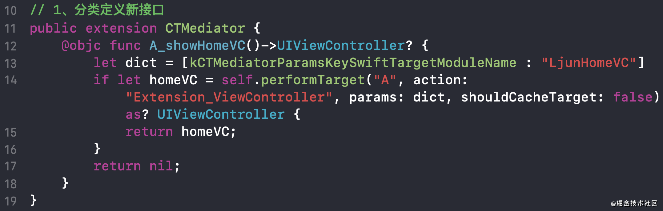CTMediator使用的是运行时解耦,解耦核心方法如下所示: