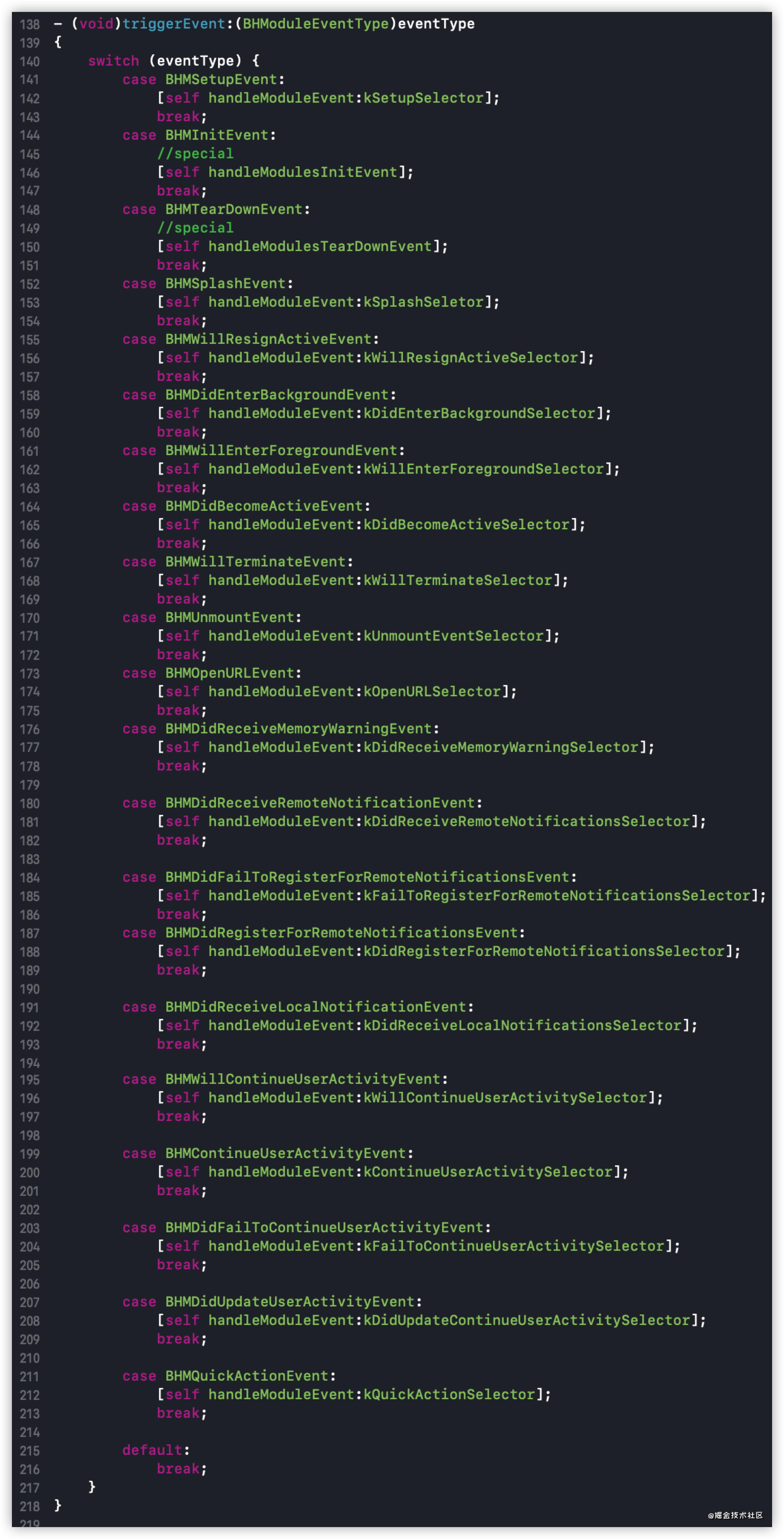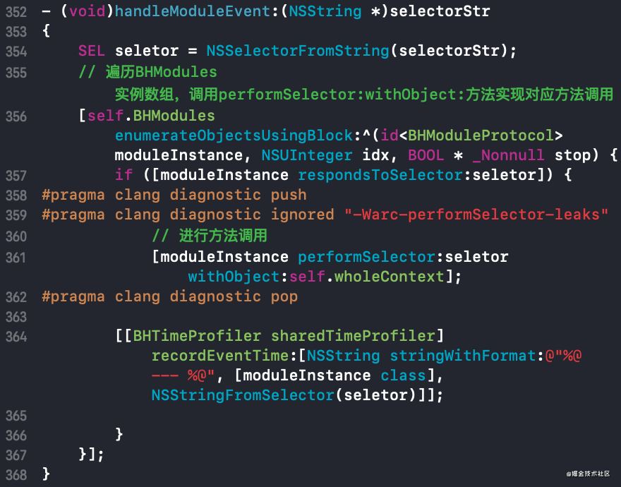 从上面的代码中可以发现,除去BHMInitEvent初始化事件和BHMTearDownEvent拆除Module事件这两个特殊事件以外,其它所有的事件都是调用的handleModuleEvent:方法,其内部实现主要是遍历BHModules实例数组,调用performSelector:withObject:方法实现对应的方法调用
